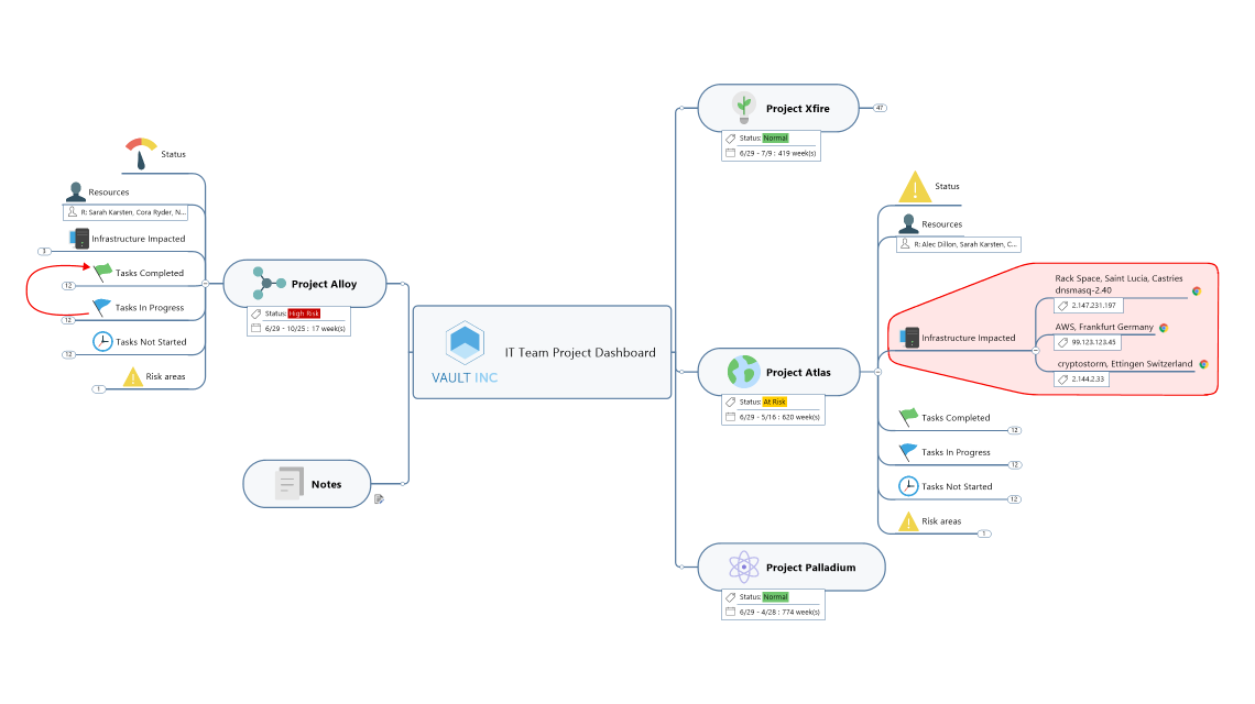 MindManager 将不同人、地点和平台中的某个概念、项目或计划相关所有信息整合入一个统一的仪表板导图中,从而解决数据丢失、理解错误和冗余等问题。仪表板导图向相关人员以相同视图展示大局和小细节。